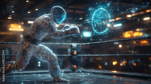 Futuristic Boxing Robot Training in Digital Ring. Generative AI
