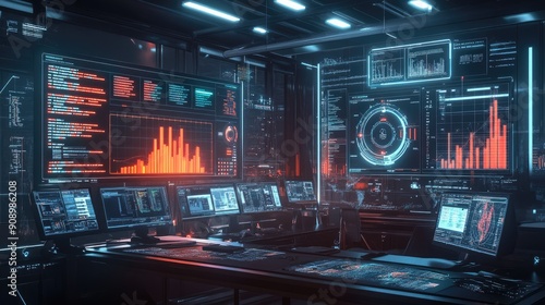 Futuristic business environment with benefit growth graphs and advanced technology for working, generative AI