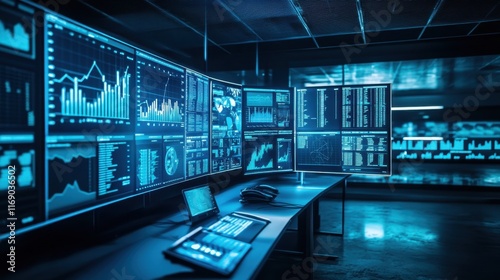 Futuristic Business War Room with High-Tech Displays and Analytics