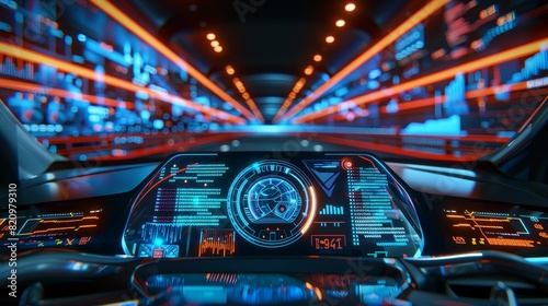 Futuristic car dashboard with advanced digital displays and glowing neon lights, illustrating high-tech automotive technology and a fast-paced environment.