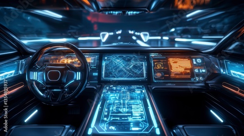 Futuristic car interior with advanced technology dashboard, illuminated controls, and digital map display.