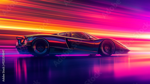 Futuristic car moving at high speed concept horizontal poster. Powerful acceleration of a supercar on a night track with colorful lights and trails. Bright colors. Digital illustration. AI artwork.