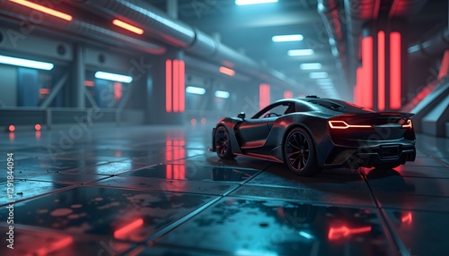 Futuristic car on sci-fi background with metallic surfaces and neon lights