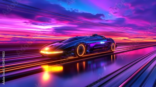 futuristic car speeding sunset highway - cyberpunk aesthetics