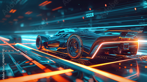 Futuristic car speeding through neon-lit digital highway, innovation concept