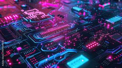 Futuristic circuit board illuminated by neon lights featuring intricate details of electronic components, ideal for technology and innovation concepts