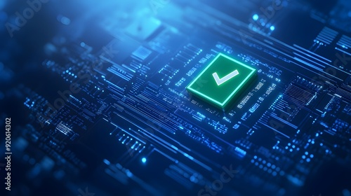 Futuristic circuit board with a glowing green checkmark symbolizing security, verification, or technology approval in a digital landscape.