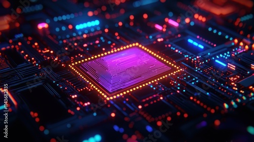 Futuristic Circuit Board with Colorful Neon Lights and Chips