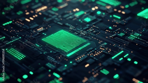 Futuristic Circuit Board with Glowing Green Lights and Complex Electronic Components in High Detail