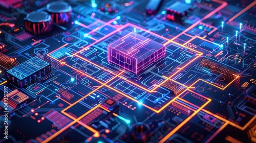 Futuristic circuit board with glowing neon lights, illustrating complex technology and advanced electronics concepts.