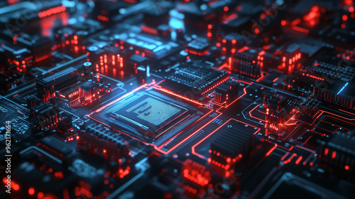 Futuristic circuit board with glowing red and blue elements, showcasing intricate details and technology.