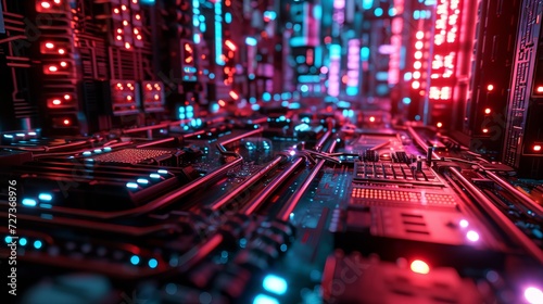 Futuristic Circuit Board with Glowing Red and Blue Lights, Detailed Texture of a Computer Motherboard