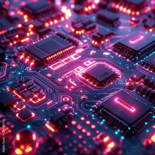 Futuristic Circuit Board with Neon Lights in 3D Render
