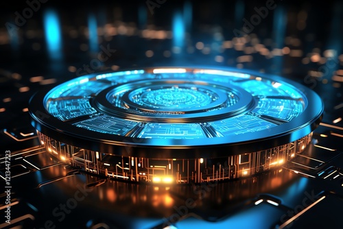 Futuristic circular tech device on circuit board.