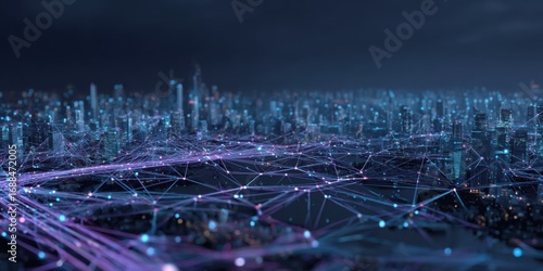 Futuristic city network at night. Abstract cityscape with glowing connections