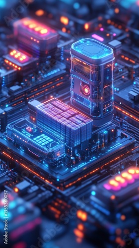 Futuristic city on circuit board, glowing, digital art, background of electronic components