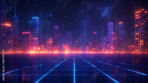Futuristic city skyline at night, featuring glowing lights and a grid. Perfect for technology, sci-fi, and digital art projects.