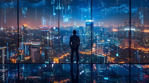 Futuristic City Skyline at Night with Glowing Skyscrapers and Digital Technology