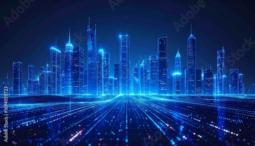 Futuristic City Skyline Glowing with Blue Neon Lights, Representing Smart Cities and Technology. Capturing the Essence of Innovation and Urban Progress.