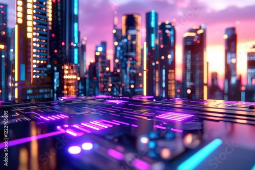Futuristic city skyline powered by blockchain technology, showcasing interconnected devices, slick design with neutral tones for focus