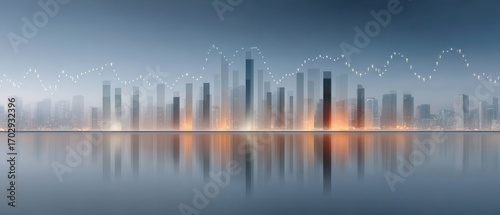 Futuristic City Skyline with Stock Market Analytics and Trends Visualization at Dawn over Calm Water