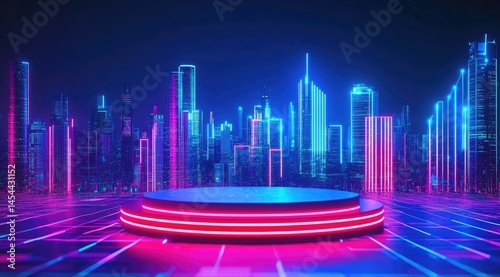 Futuristic city stage with neon lights. A circular platform is set in front of a cityscape lit with vibrant neon colors