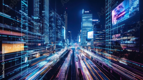 Futuristic cityscape at night with digital overlays showing data streams and light trails.