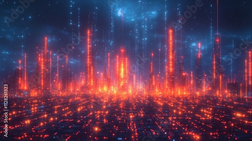Futuristic cityscape at night with glowing red and blue digital towers and particles.