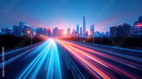 Futuristic Cityscape at Night with Light Trails on Highways and Skyscrapers