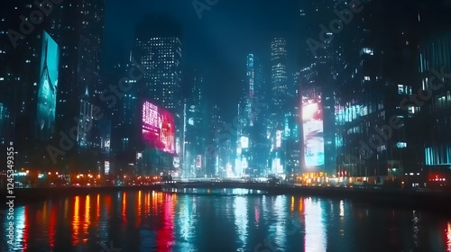 Futuristic cityscape at night with towering skyscrapers illuminated by neon lights and holographic billboards. A river flows through the center, reflecting vibrant streetlights