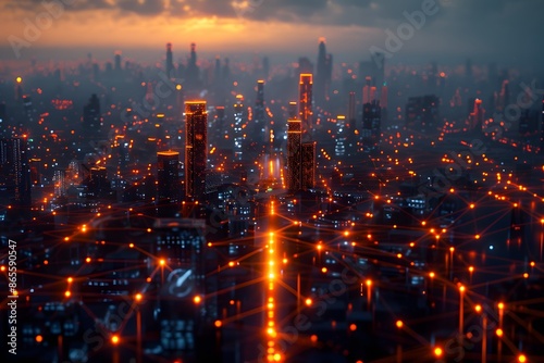 Futuristic Cityscape Illuminated by Network of Glowing Lights at Dusk