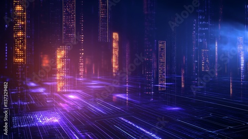 Futuristic cityscape in neon colors with glowing lines and digital elements, evoking technology and innovation