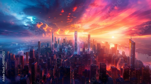 Futuristic cityscape on an alien planet, featuring towering skyscrapers with advanced architectural designs under a colorful sky, offering expansive copy space for text