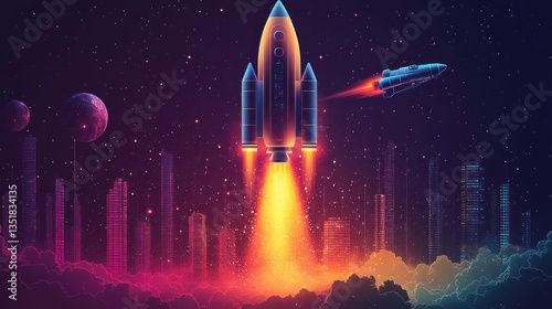Futuristic Cityscape Rocket Launch: A Digital Art