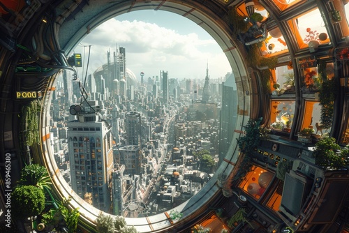 Futuristic cityscape viewed through a circular window with lush indoor plants and high-rise buildings under a blue sky.
