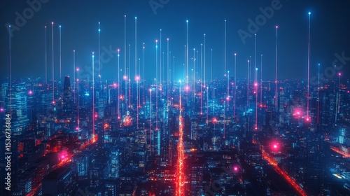 Futuristic cityscape with bright neon lights and digital lines, creating an atmosphere of technological future. Ideal for technology blogs, innovative product presentations and science fiction.