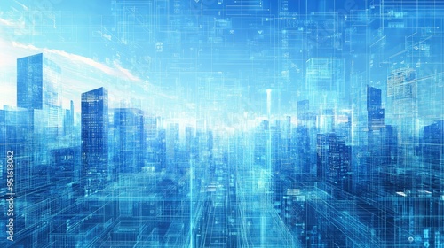 Futuristic cityscape with digital blueprints overlay