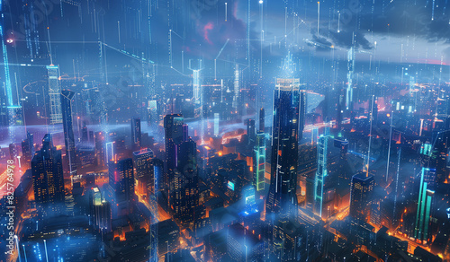 Futuristic cityscape with digital connections and data flow lines, illuminated in the style of neon lights at night