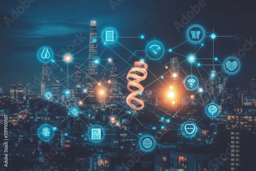 Futuristic Cityscape with Digital Connections and Data Visualizations at Night, Showcasing Technological Integration and Urban Development Concepts