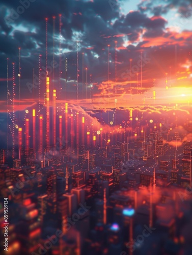 Futuristic Cityscape with Digital Data Visualization at Sunset, High-Tech Urban Skyline with Glowing Data Streams