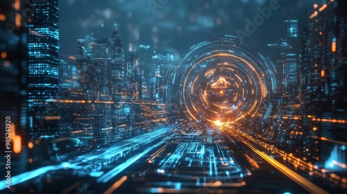 Futuristic Cityscape with Digital Interface and Light Trails