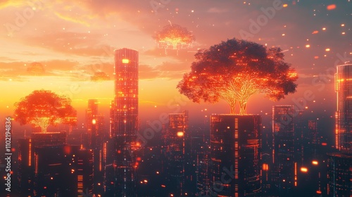 Futuristic Cityscape with Digital Trees and Data Connections - AI generated illustration