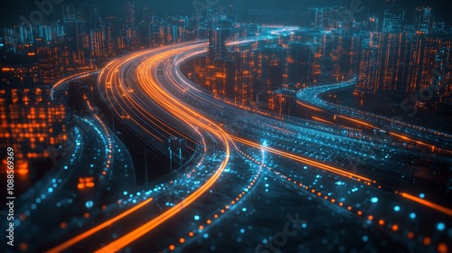 Futuristic Cityscape With Glowing Blue And Orange Lights, Representing High Speed Internet And Data