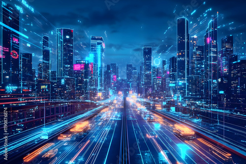 Futuristic cityscape with glowing lights and digital effects.