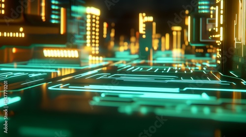 Futuristic cityscape with glowing neon circuits and buildings at night, showcasing advanced technology