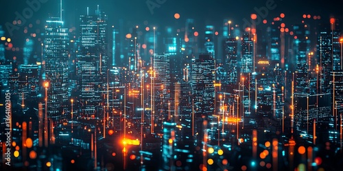 Futuristic cityscape with glowing neon lights and digital networks showcasing advanced technology and urban development at night