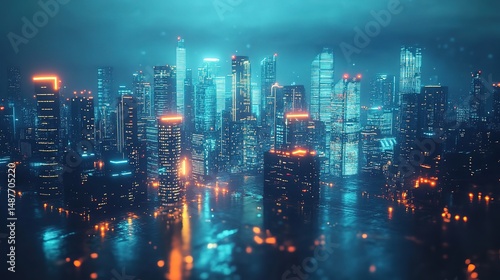 Futuristic cityscape with glowing neon lights and geometric architecture, embodying a vision of advanced urban harmony.