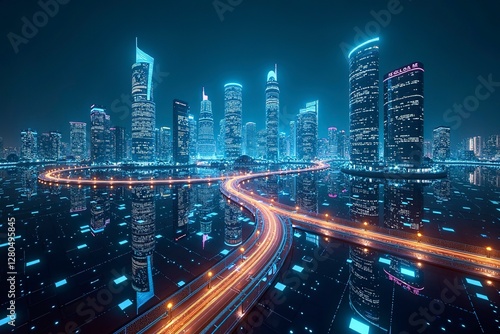 Futuristic cityscape with glowing structures and digital pathways, showcasing advanced urban innovation.