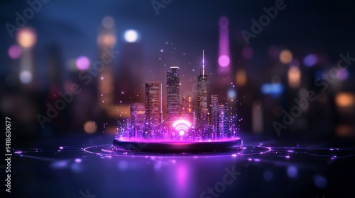 Futuristic cityscape with glowing Wi-Fi symbol