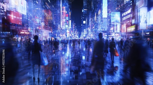 Futuristic Cityscape with Holographic Shopping Bags Neon Lights and Blurred Crowds